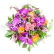 Share the bliss of vibrant colors with our colorful bliss bouquet, featuring a lively combination of orange, pink, and purple flowers, complemented by rich greenery.